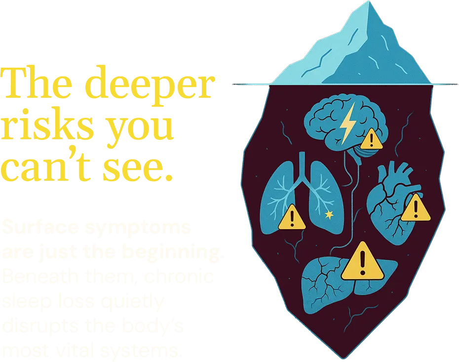 Surface symptoms are just the beginning. Beneath them, chronic sleep loss quietly disrupts the body’s most vital systems.