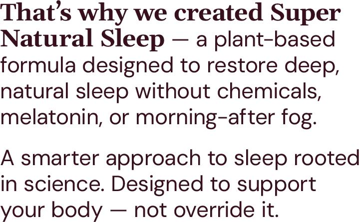 That’s why we created Super Natural Sleep — a plant-based formula designed to restore deep, natural sleep without chemicals, melatonin, or morning-after fog.
